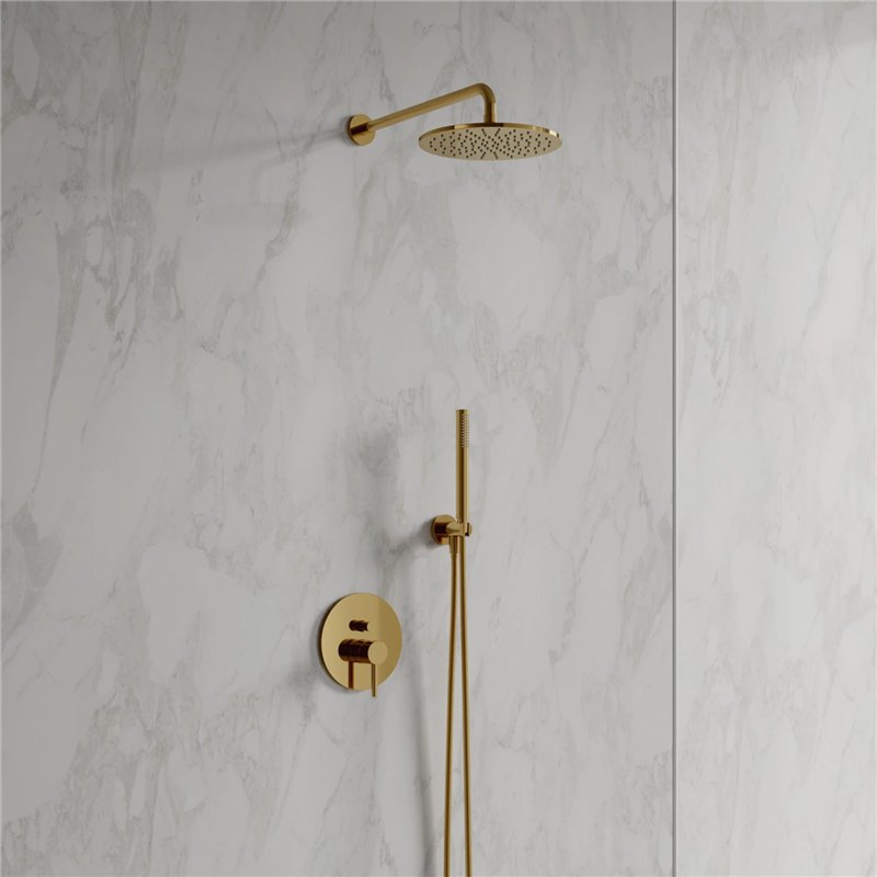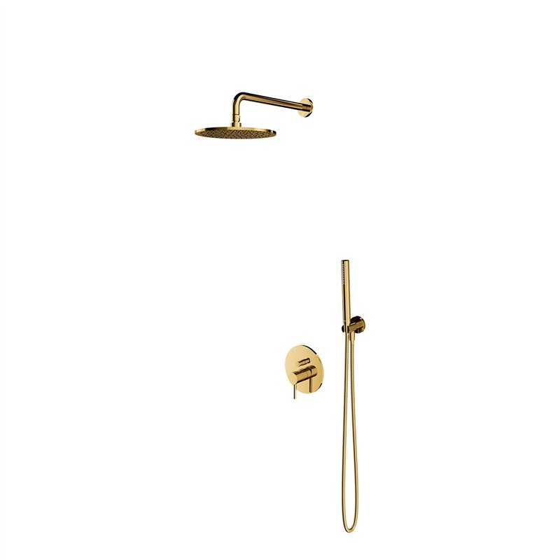 Système de douche encastré Collection Y en laiton, avec tête de douche Ø25 cm, bras de 41 cm, douchette 1 fonction avec flexible 150 cm, disponible en plusieurs finitions.