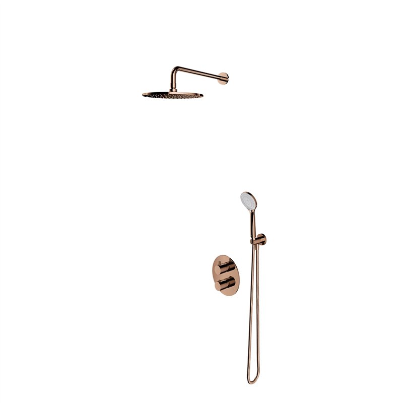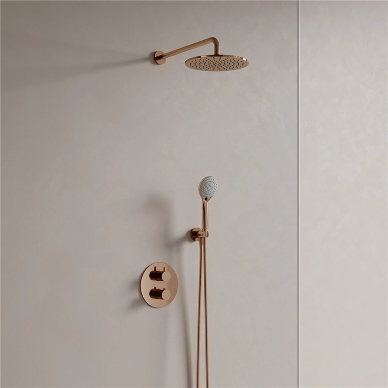 L’ensemble comprend un mitigeur thermostatique encastré à 2 sorties avec son élément encastré, une tête de douche avec bras, un pommeau de douche avec flexible ainsi qu’un raccord mural avec support, pour une installation complète.