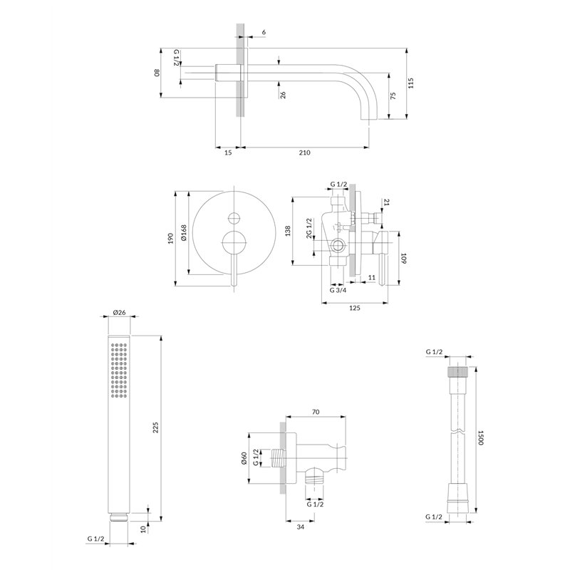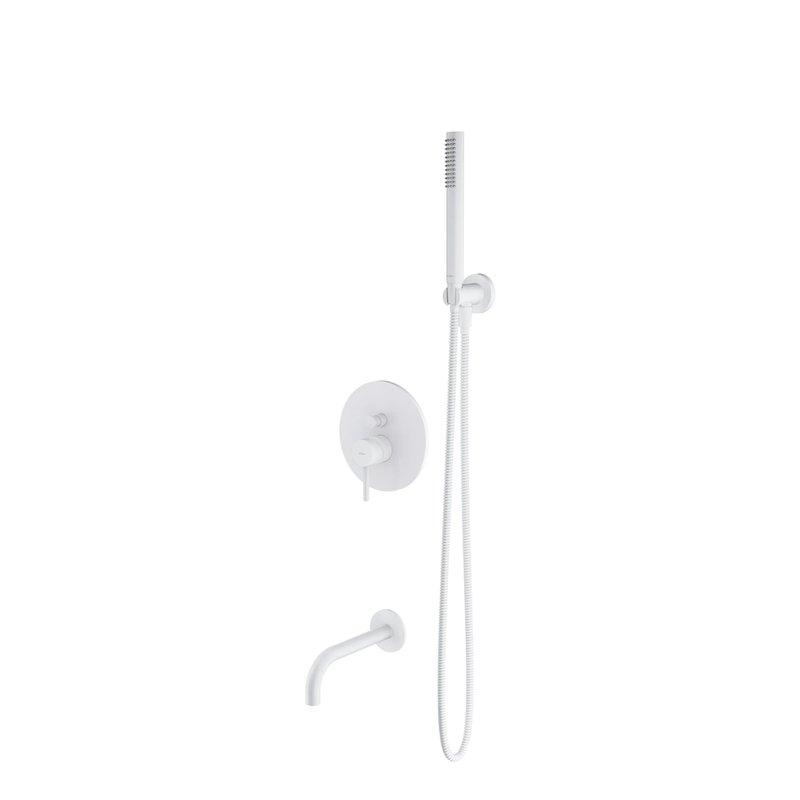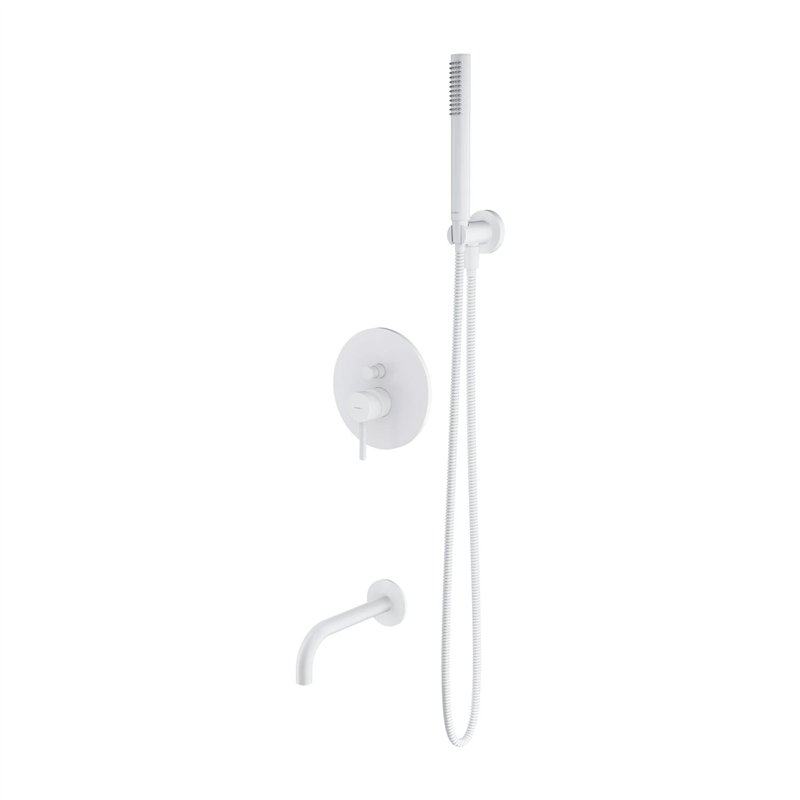 L’ensemble comprend un mitigeur encastré, un bec mural, un pommeau de douche avec flexible ainsi qu’un raccord mural avec support, pour une installation complète dédiée à la baignoire.
