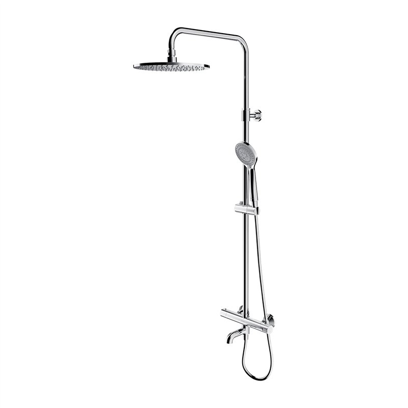L’ensemble comprend un mitigeur thermostatique, une tête de douche avec bras, un pommeau de douche avec flexible ainsi qu’un support réglable en hauteur.