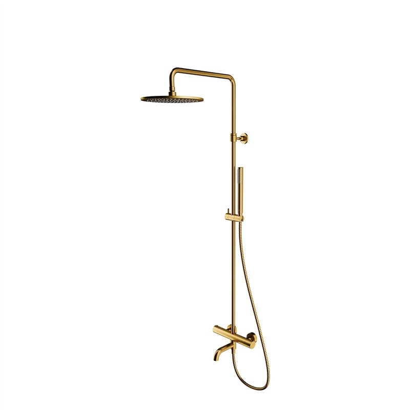 Disponible en finitions blanc mat, chrome poli, nickel brossé, graphite brossé, cuivre brossé, cuivre poli, laiton brossé, or poli, or brossé et noir semi-mat, le système de bain thermostatique Collection Y est conçu pour une installation murale apparente, offrant une solution complète pour la baignoire et la douche.