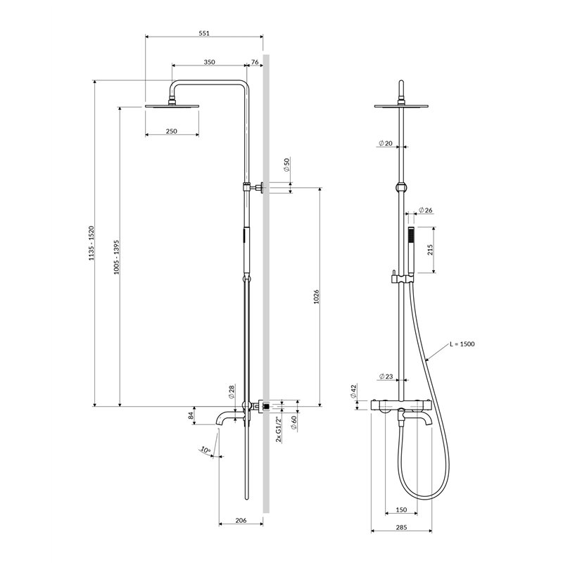 L’ensemble comprend un mitigeur thermostatique, une tête de douche avec bras, un bec de baignoire pliable, un pommeau de douche avec flexible ainsi qu’un support réglable en hauteur.
