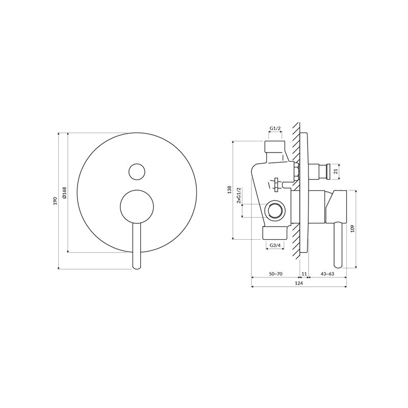 Mitigeur bain / douche à encastrer Collection Y avec 2 sorties, rosette Ø17 cm, cartouche céramique Ø40 mm et élément encastré inclus, disponible en plusieurs finitions.