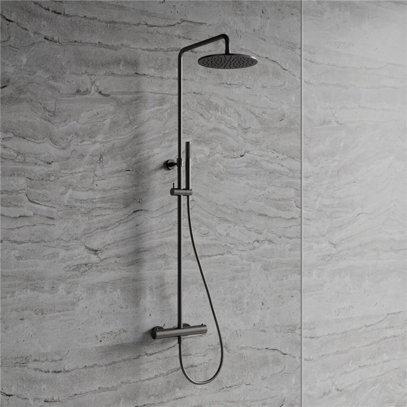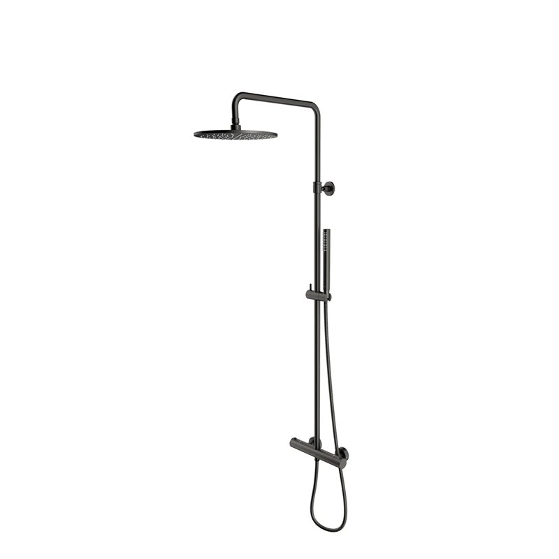 L’ensemble comprend un mitigeur thermostatique, une tête de douche avec bras, un pommeau de douche avec flexible ainsi qu’un support réglable en hauteur.