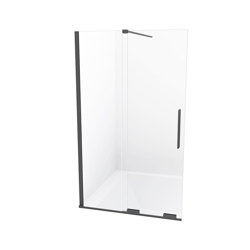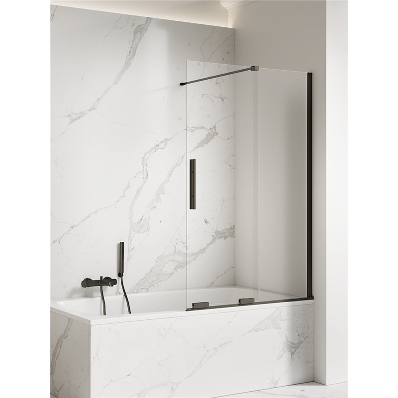 Pare-baignoire double panneau avec verre trempé clair 6 mm et deux volets pivotants (180° et 90°) pour une ouverture flexible et un accès facilité. Profilés aluminium avec revêtement PVD, installation réversible et ajustable pour une pose précise.