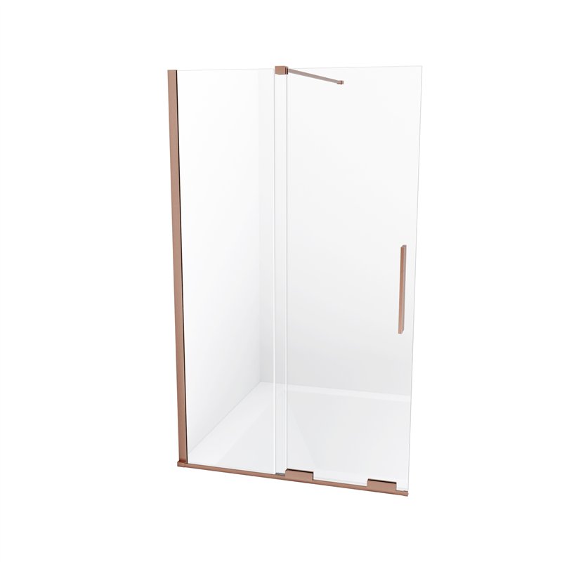 Pare-baignoire double panneau avec verre trempé clair 6 mm et deux volets pivotants (180° et 90°) pour une ouverture flexible et un accès facilité. Profilés aluminium avec revêtement PVD, installation réversible et ajustable pour une pose précise.