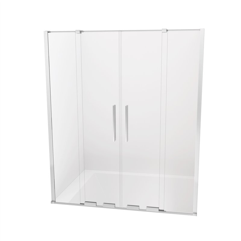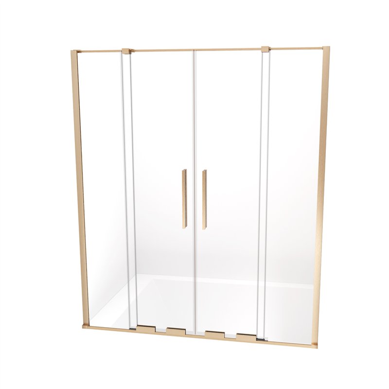 Pare-baignoire double panneau avec verre trempé clair 6 mm et deux volets pivotants (180° et 90°) pour une ouverture flexible et un accès facilité. Profilés aluminium avec revêtement PVD, installation réversible et ajustable pour une pose précise.