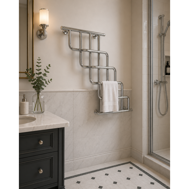 Cette composition unique apporte du rythme et de la profondeur à l’espace, faisant du radiateur un élément décoratif central dans la salle de bain.