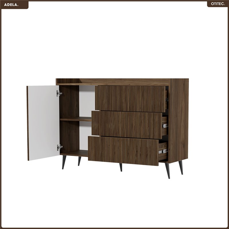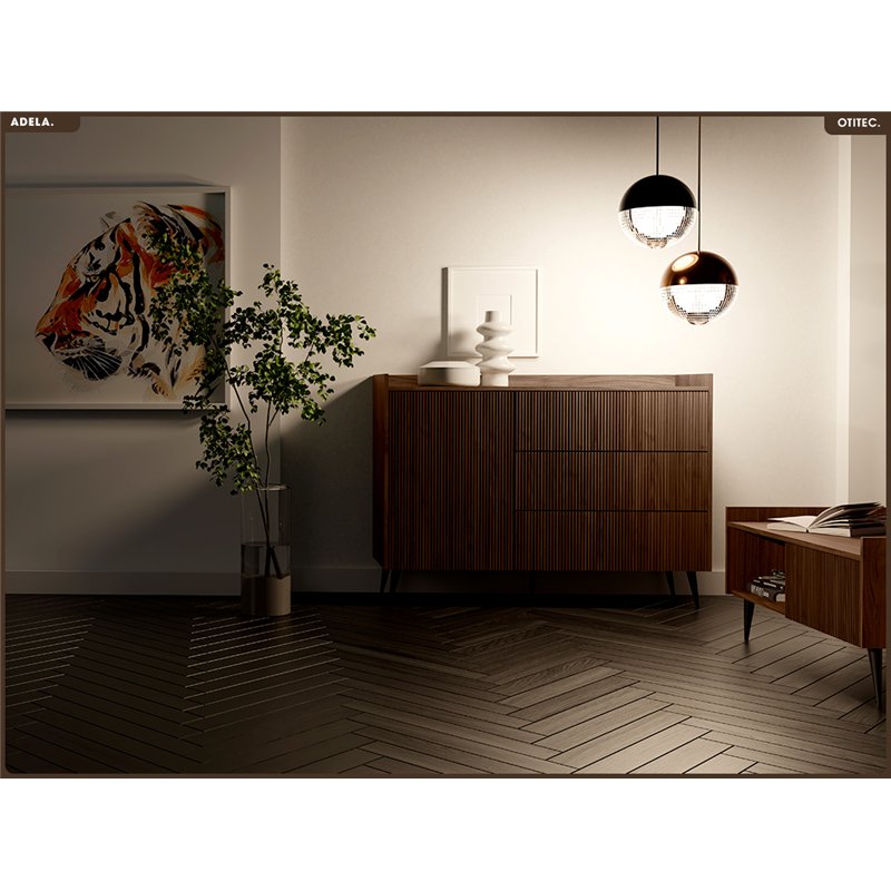 • Esthétique affirmée : Façades rainurées verticales, teinte chaleureuse du noyer, volumes équilibrés. ADELA impose une présence élégante et originale, sans alourdir l’espace.