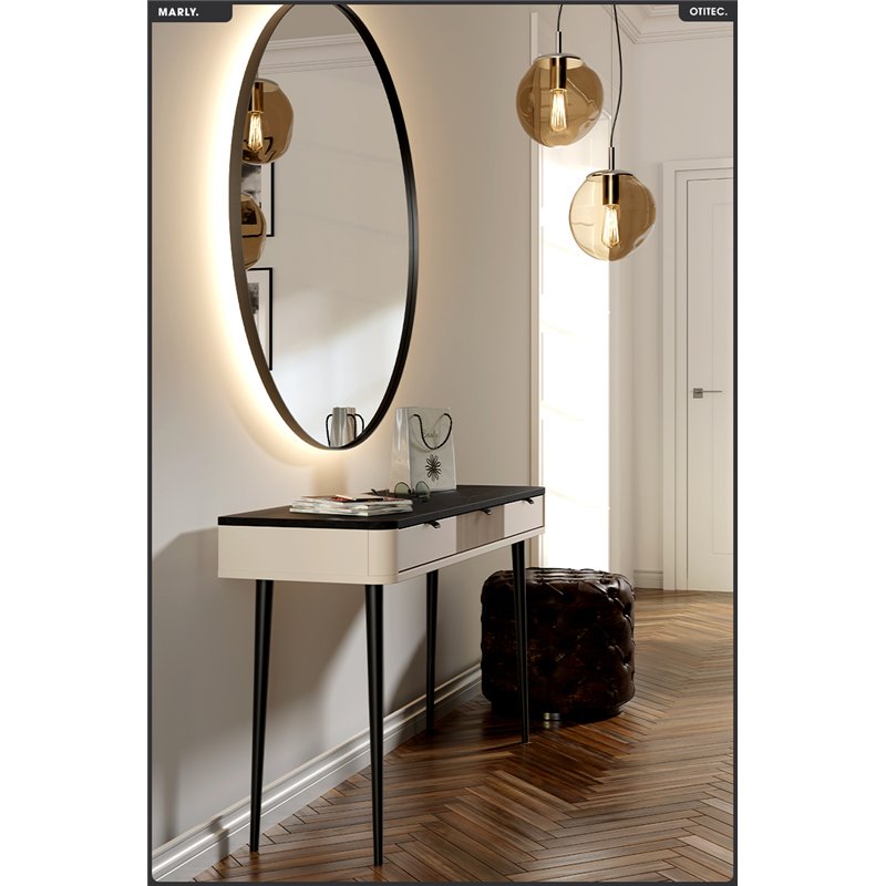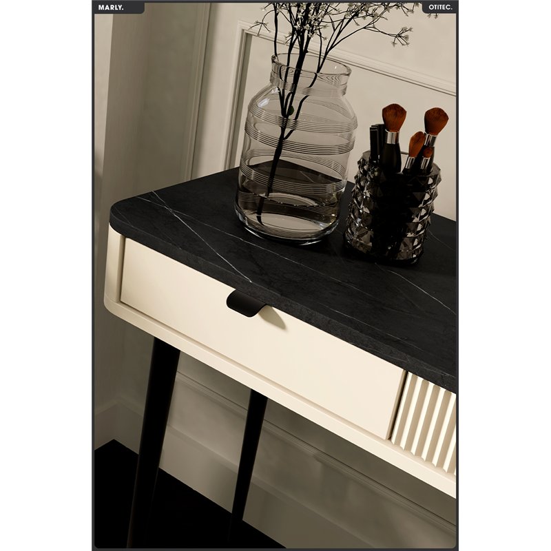 La coiffeuse VANA allie un design graphique et élégant à une finition cachemire soignée, avec des lignes travaillées et des rangements pratiques, le tout dans une conception robuste pensée pour un usage quotidien durable.