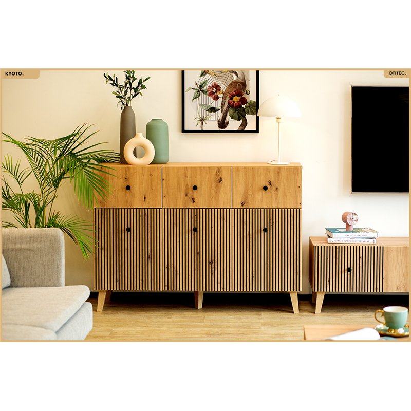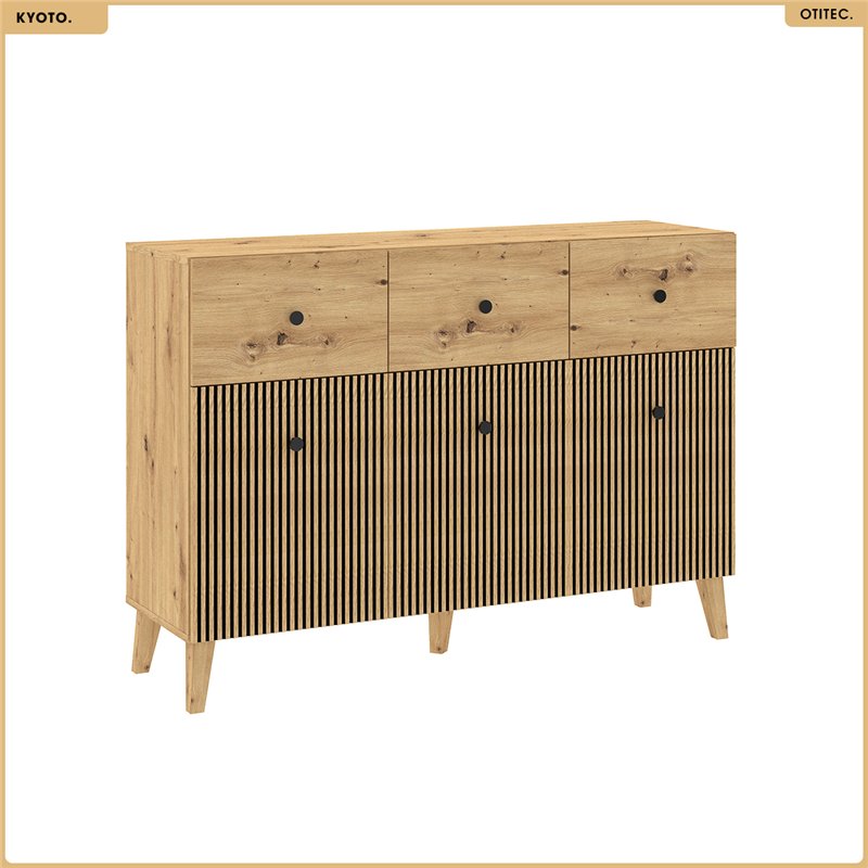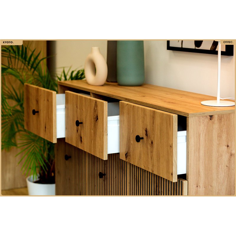 Commode KYOTO 95 x 135 x 42 cm en finition chêne artisanal, avec façades à reliefs verticaux et design épuré.