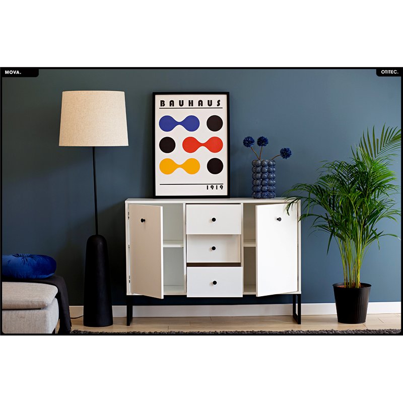 • Design maîtrisé : Finition blanche mate, poignées en métal noir semi-mat et piètement assorti. Un équilibre parfait entre sobriété et caractère.