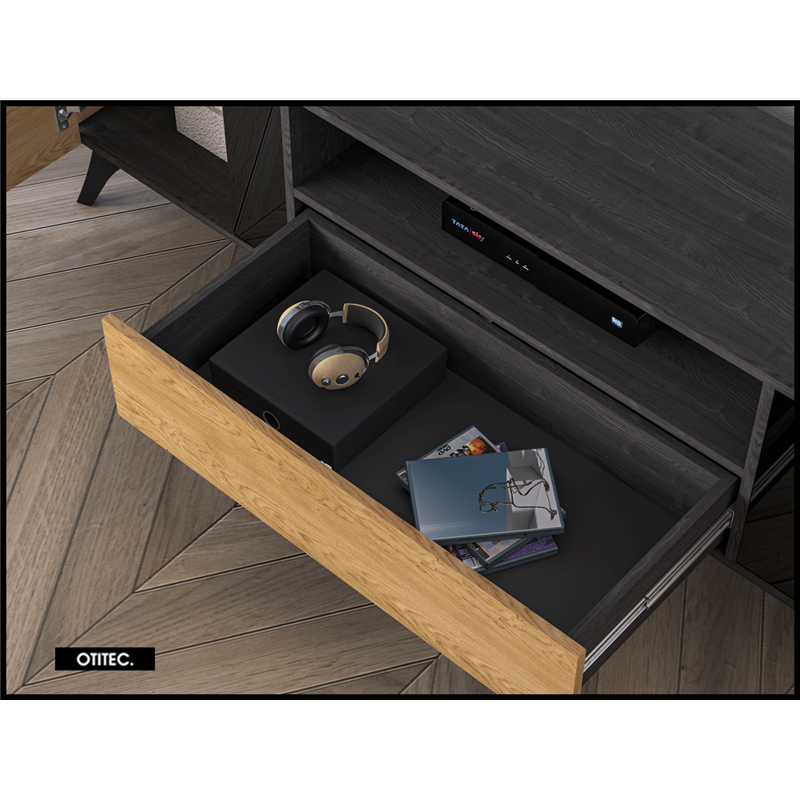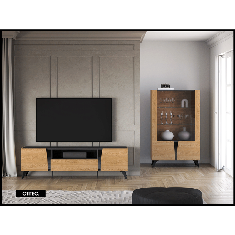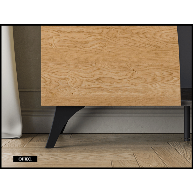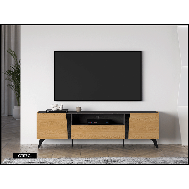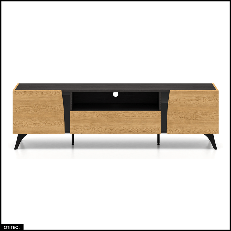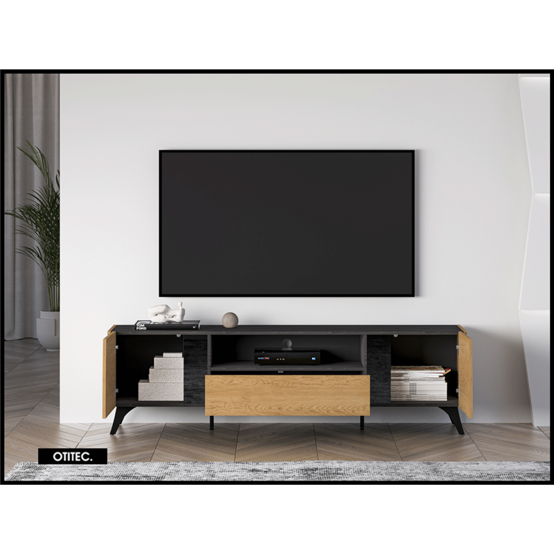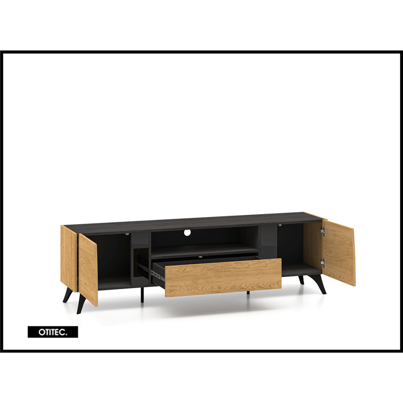 Le meuble TV TOSCANE 180 cm en finition chêne combine design moderne, rangements spacieux et pieds métalliques élégants, avec fermeture douce et grande capacité de stockage, offrant une solution fonctionnelle, durable et raffinée pour votre salon.