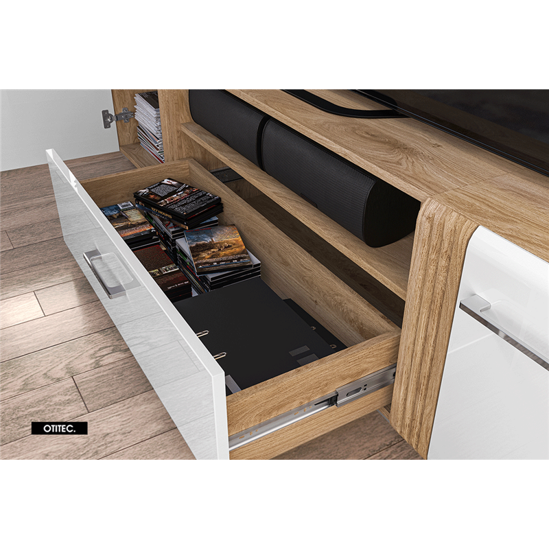 Le meuble TV ADAGY 150 cm combine un design moderne chêne et blanc avec des rangements fonctionnels, des tiroirs à extension complète et des matériaux résistants, idéal pour un usage quotidien durable et pratique.