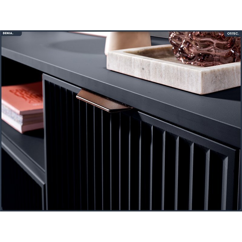 • Esthétique affirmée : Façades rainurées verticales, volumes équilibrés, piétement en métal noir. Un style contemporain qui joue sur les contrastes et les textures, sans surcharge.