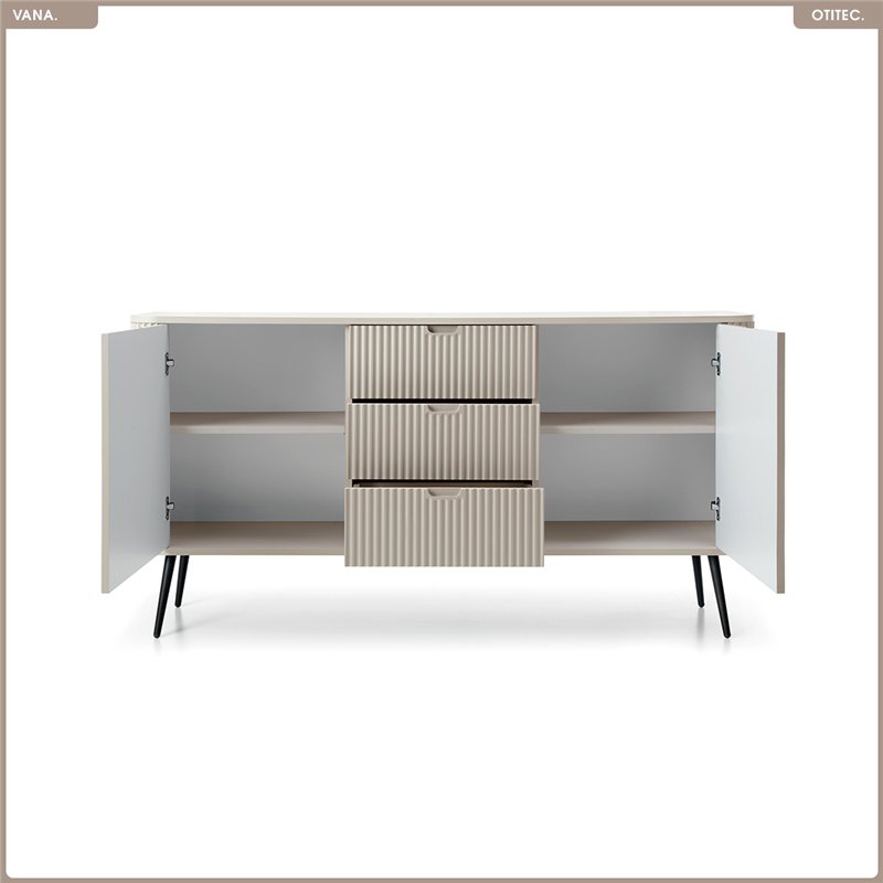 Commode MOVA 82 x 115 x 33 cm au design minimaliste avec finition cachemire mat et éléments en métal. Elle offre des rangements pratiques avec tiroirs à ouverture fluide pour un usage quotidien confortable. Un meuble compact et élégant, idéal pour un intérieur moderne et structuré.