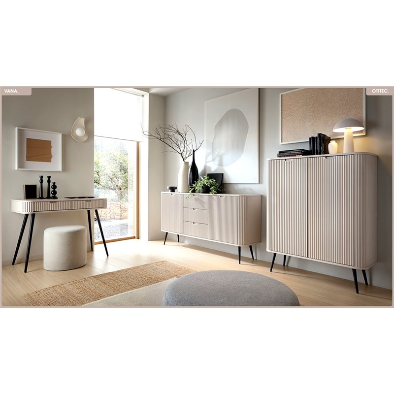 • Design graphique et sculptural : Façades rainurées verticales, angles galbés, lignes douces. Un travail du relief qui donne à chaque meuble une présence visuelle forte et raffinée.