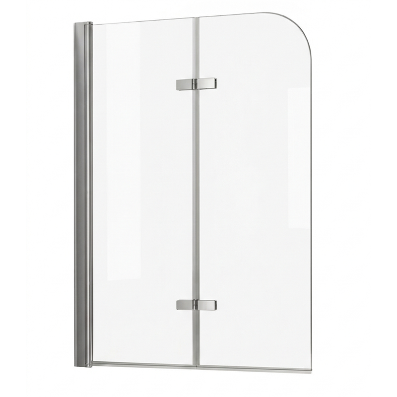 Pare-baignoire double panneau avec verre trempé clair 6 mm et deux volets pivotants (180° et 90°) pour une ouverture flexible et un accès facilité. Profilés aluminium avec revêtement PVD, installation réversible et ajustable pour une pose précise.