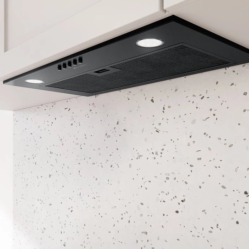 Hotte encastrable Globalo Melavio 60.1 Black, sans éclairage intégré pour une installation LED personnalisée. Format compact (23 cm), fonctionnement silencieux dès 45 dB et 3 vitesses pour une solution discrète et flexible.