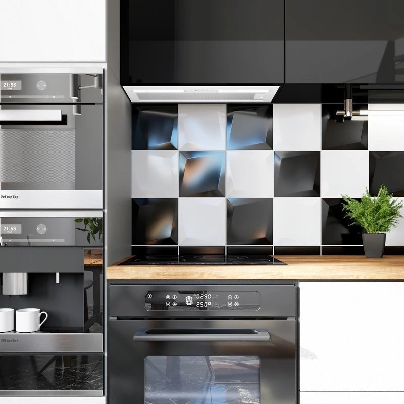 Hotte encastrable au design sophistiqué alliant acier laqué et verre trempé, offrant une aspiration périmétrale puissante pour une cuisine sans odeurs. Intégration invisible, éclairage LED efficace et finitions haut de gamme en Noir ou Blanc.