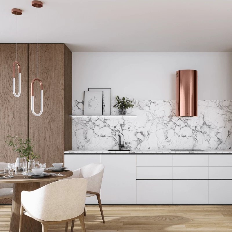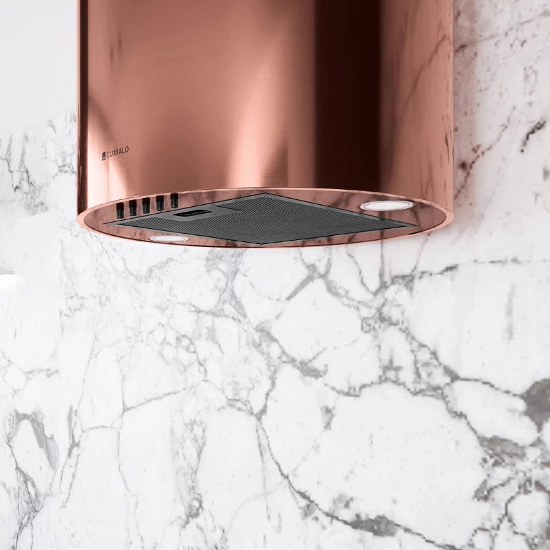 Disponible dans une palette de finitions prestigieuses — Noir profond, Blanc pur, Inox brossé, Doré Caramel ou Cuivre Vin — la Lobelio s'adapte à toutes les ambiances, des plus industrielles aux plus luxueuses. Avec une capacité d'aspiration maximale de 570 m³/h, elle garantit un air purifié en un temps record.