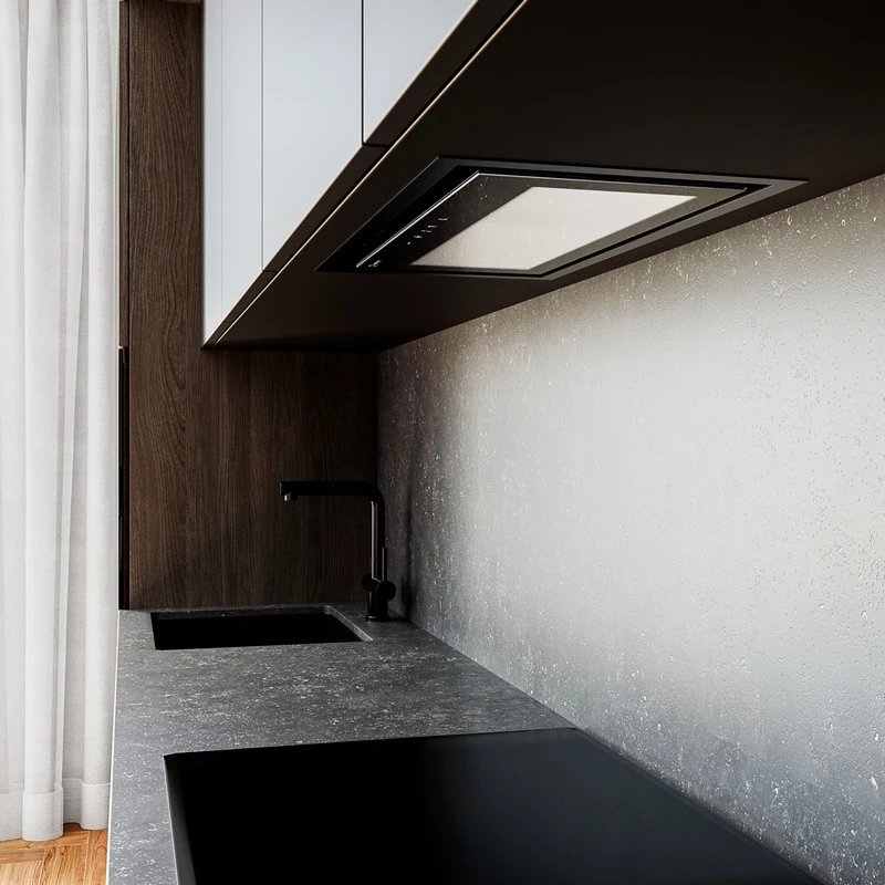La hotte Salviro 60.1 a été spécifiquement développée pour se loger discrètement à l'intérieur d'un meuble haut. Ce mode d'installation "box" permet de conserver l'unité esthétique de votre cuisine tout en libérant de l'espace visuel. Disponible en noir profond ou en blanc classique, elle se fond harmonieusement dans tous les styles d'intérieurs, du plus contemporain au plus traditionnel.