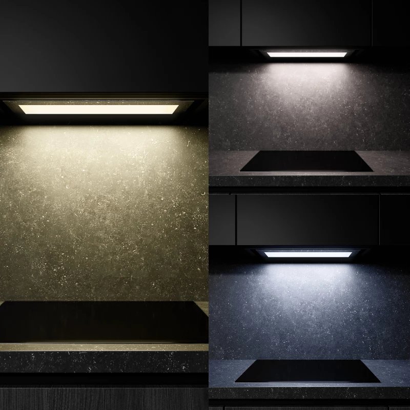 L'éclairage LED intégré projette une lumière vive et naturelle sur toute la surface de cuisson, vous offrant une visibilité parfaite sur vos casseroles tout en étant extrêmement économe en énergie. Les commandes, situées sur la partie inférieure, sont simples d'utilisation et permettent un réglage précis des fonctions de la hotte d'un simple geste.