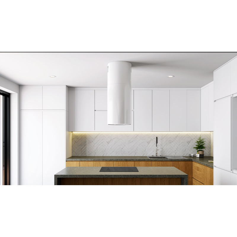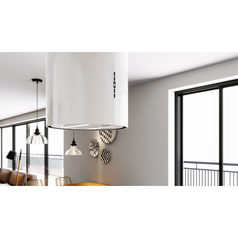 La hotte Wereniso Isola 39.1 a été spécifiquement conçue pour être le point focal des cuisines ouvertes. Sa forme cylindrique parfaite, suspendue au-dessus de votre îlot, libère l'espace visuel tout en affirmant un caractère luxueux. Sa structure en acier inoxydable de haute qualité, associée à un fond en verre élégant, assure une finition irréprochable sous tous les angles.