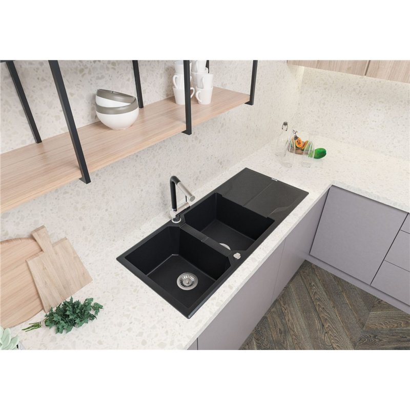 Évier en granit ANDANTE 2 cuves 1160 mm avec égouttoir, résistant à la chaleur et aux chocs, avec vidage automatique et siphon compact inclus.