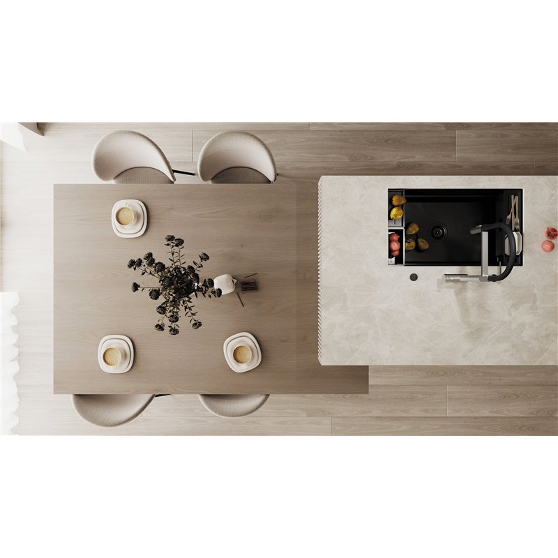 Disponible en formats 760 x 520 x 220 mm et 560 x 520 x 220 mm, et en finitions albâtre, graphite métallisé, noir, gris métallisé et anthracite métallisé, l’évier en granit MAGNETIC s’adapte à différentes configurations de cuisine.
