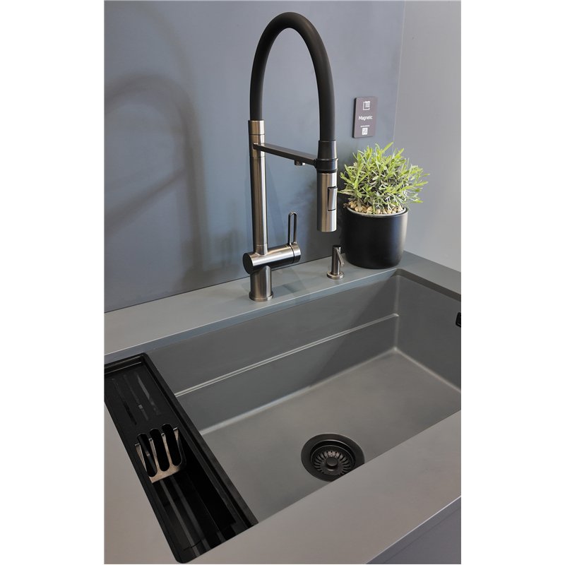 Ce modèle intègre un système magnétique invisible permettant d’ajouter différents accessoires autour de l’évier selon les besoins.