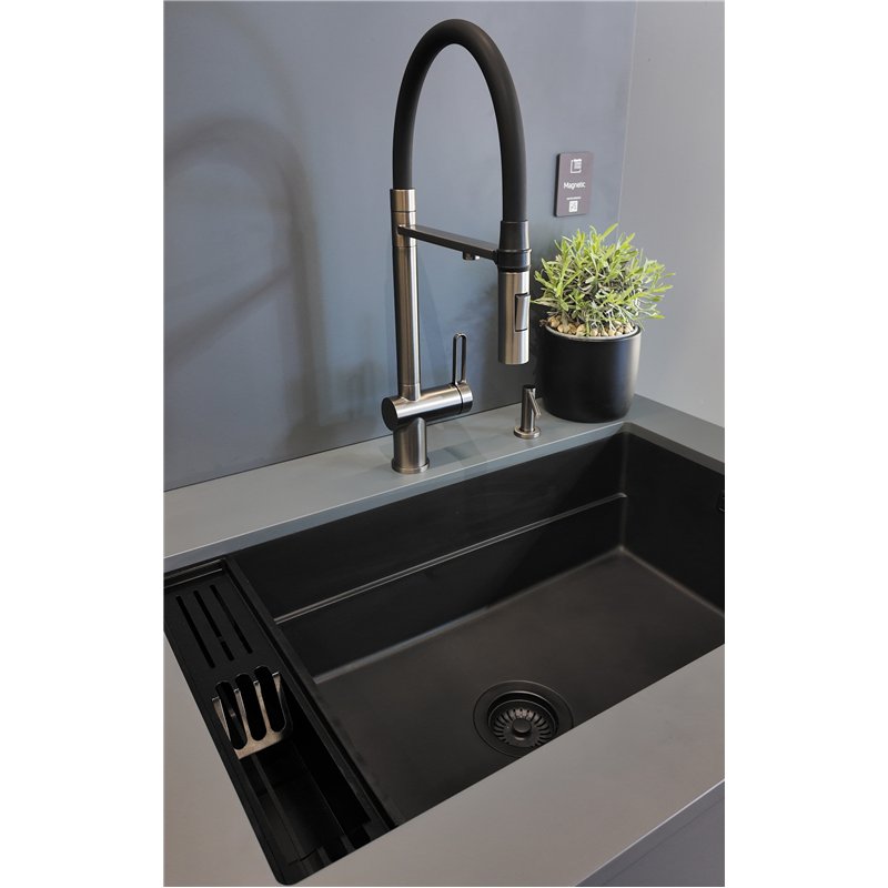 Ce modèle intègre un système magnétique invisible permettant d’ajouter différents accessoires autour de l’évier selon les besoins.