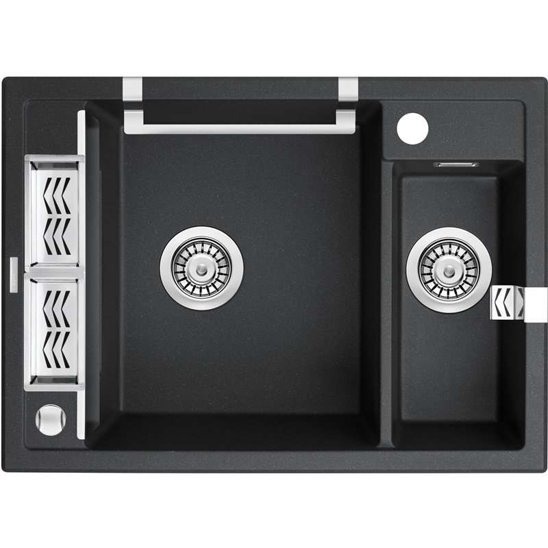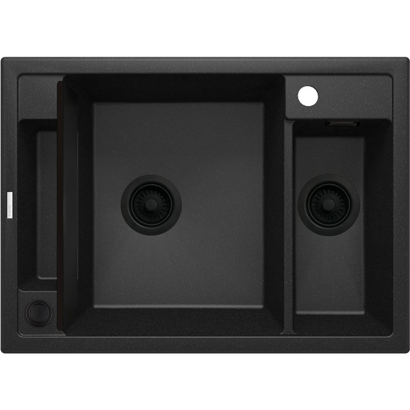 Évier granit MAGNETIC 690 x 500 x 219 mm, 1,5 cuve, avec système magnétique invisible, grille acier, vidage automatique et siphon inclus.