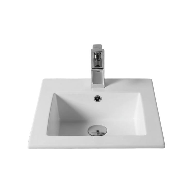 Vasque à encastrer rectangulaire VELIA en céramique sanitaire, dimensions 41,5 x 41,5 cm, sans trou de robinetterie ni trop-plein.
