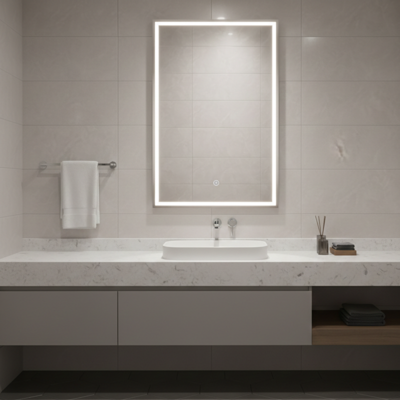 • Éclairage LED intégré en façade, positionné sur la surface du miroir