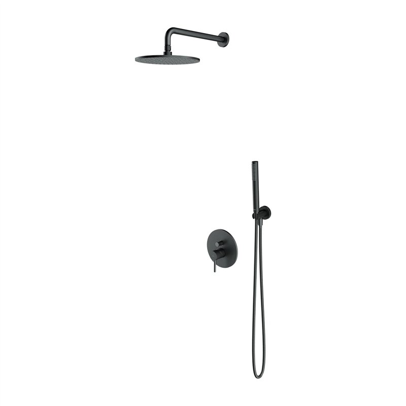L’ensemble comprend un mitigeur encastré, une tête de douche, un bras de douche, un pommeau de douche avec flexible et un raccord mural avec support, pour une installation complète.