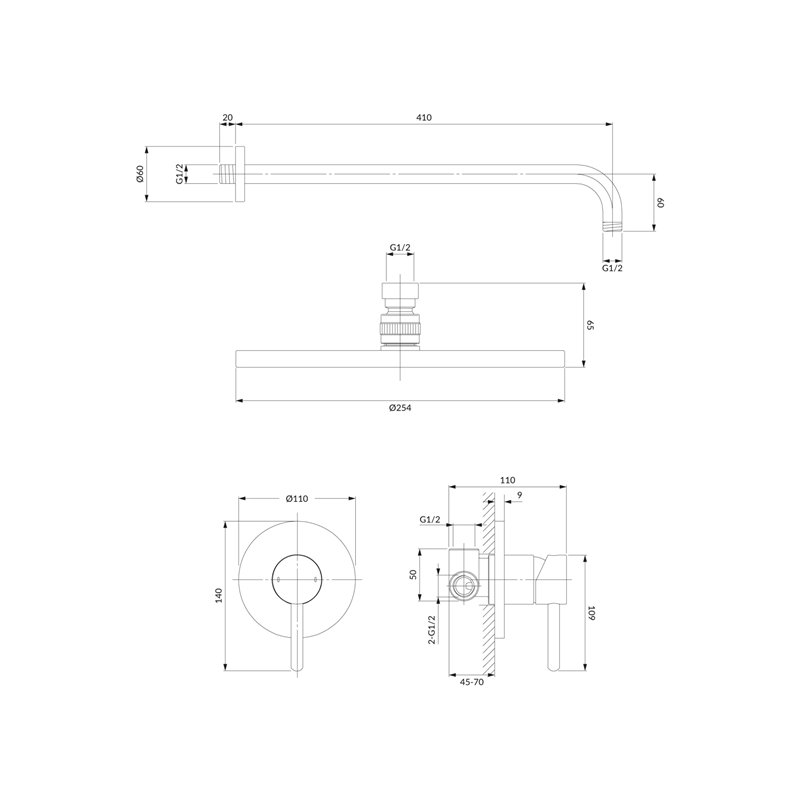 L’ensemble comprend un mélangeur encastré ainsi qu’une tête de douche avec bras, pour une solution simple et fonctionnelle dédiée à l’espace douche.