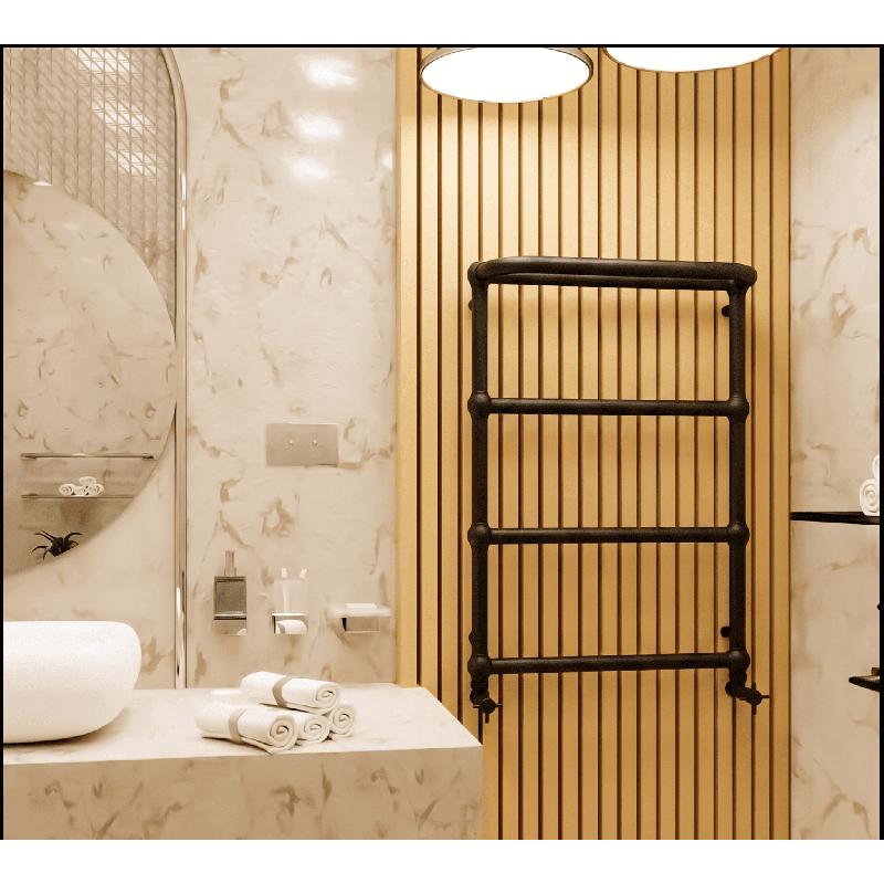 Radiateur vertical au style rétro élégant, idéal pour salle de bain ou intérieur haut de gamme. Sa structure à sphères décoratives assure une diffusion homogène de la chaleur tout en apportant une signature esthétique unique.