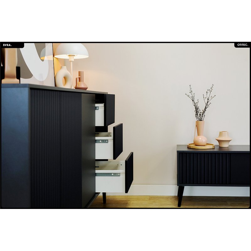 Design maîtrisé : Façades en MDF ondulé finition mate, pieds fuselés en bois teinté noir. Un contraste sobre et affirmé, pour un rendu à la fois discret et puissant.
