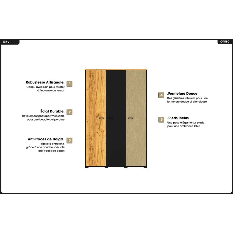Des teintes chêne, liège et noir avec des finitions discrètes : la collection OKU affirme un style sobre et sophistiqué. Chaque pièce est pensée pour s’intégrer avec naturel dans un intérieur moderne et design.