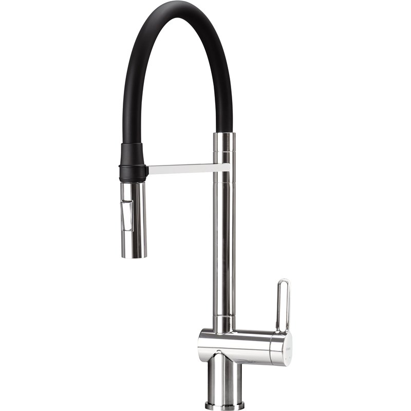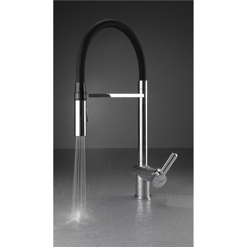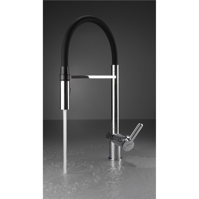 Disponible en finitions titane, noir, chrome, acier inoxydable brossé, or brossé et bronze brossé, le mitigeur d’évier MAGNETIC avec bec flexible est conçu pour un usage pratique et fluide en cuisine.