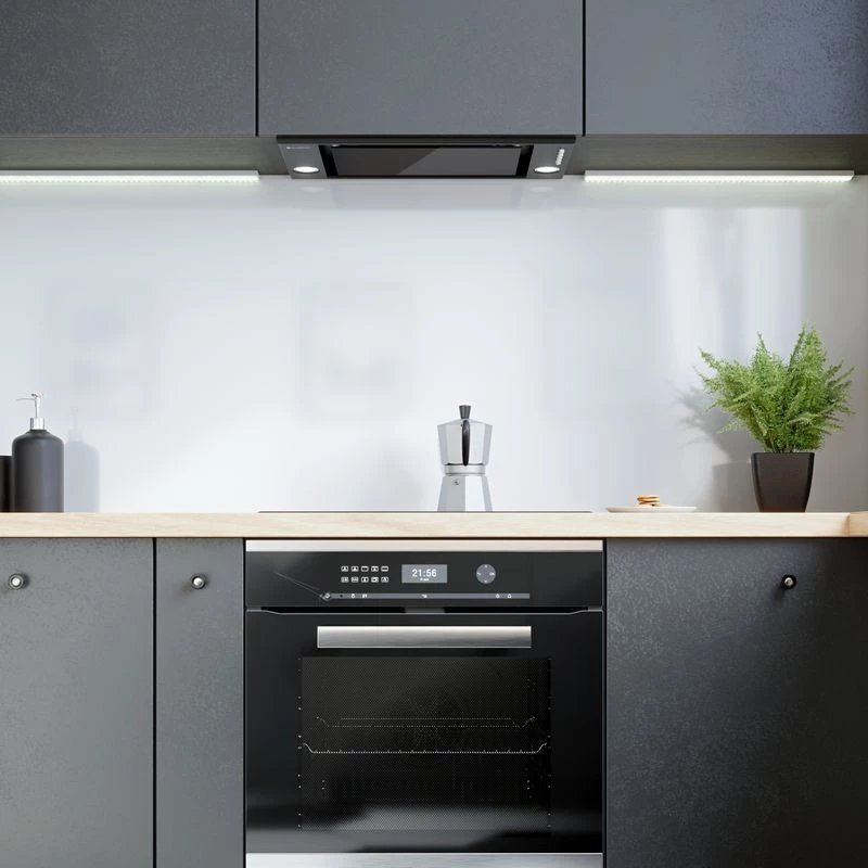 Hotte encastrable Globalo Dismo 60.1 Black, avec une puissance jusqu’à 455 m³/h et fonctionnement silencieux dès 45 dB. Façade en verre trempé, éclairage LED et 3 vitesses pour une cuisine propre et moderne.