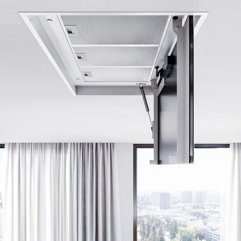 La hotte de plafond Novelti 100.1 est l'alliance parfaite entre discrétion absolue et haute technologie. Conçue pour s'intégrer totalement dans un faux plafond (encastrement de seulement 24 cm), elle libère l'espace visuel de votre cuisine tout en offrant une puissance d'aspiration exceptionnelle allant jusqu'à 740 m³/h. Sa façade en verre trempé élégant et son système de turbine déportée permettent de déporter la source sonore hors de la cuisine pour un confort acoustique inégalé. Entièrement pilotable par télécommande, elle représente le sommet du confort moderne pour les cuisines contemporaines.