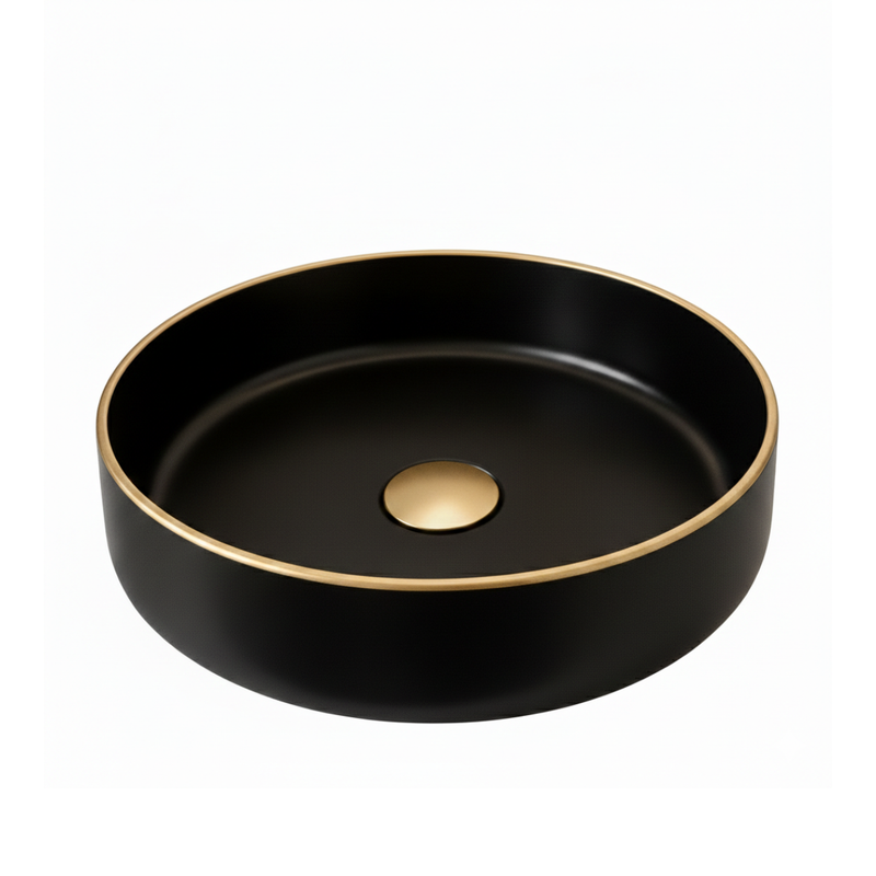 Vasque à poser ronde AURIS RONDA Ø 41,5 cm en céramique sanitaire avec finition noir mat et liseré décoratif or mat, sans trou de robinetterie ni trop-plein.