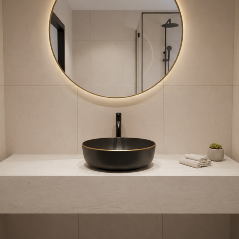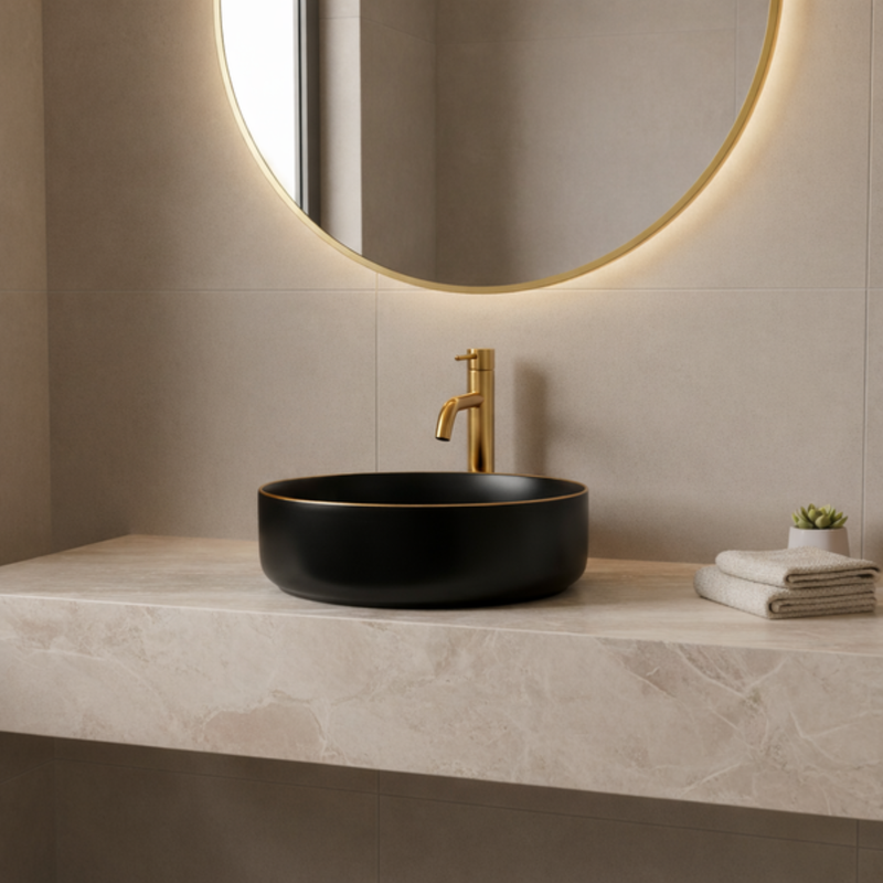 La vasque à poser AURIS RONDA NOIR combine élégance contemporaine et raffinement décoratif. Sa forme ronde harmonieuse est mise en valeur par une finition noir mat profonde, soulignée par un liseré or mat décoratif, crée un contraste élégant et apporte du caractère à votre salle de bain