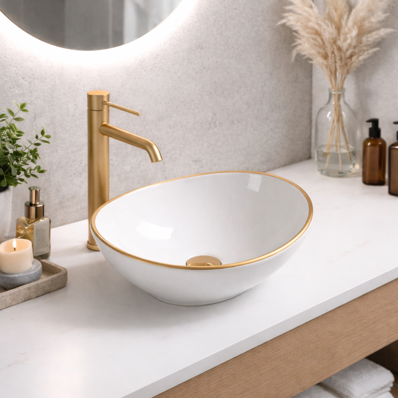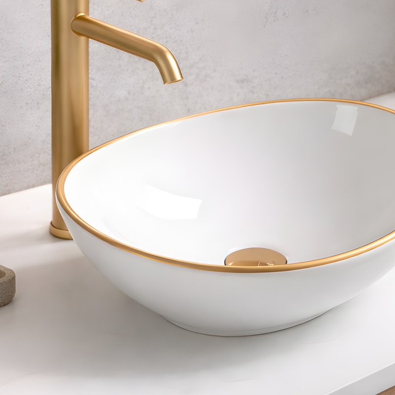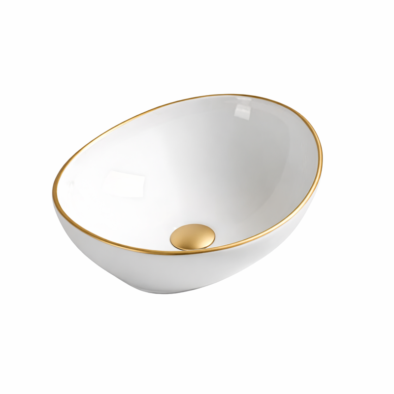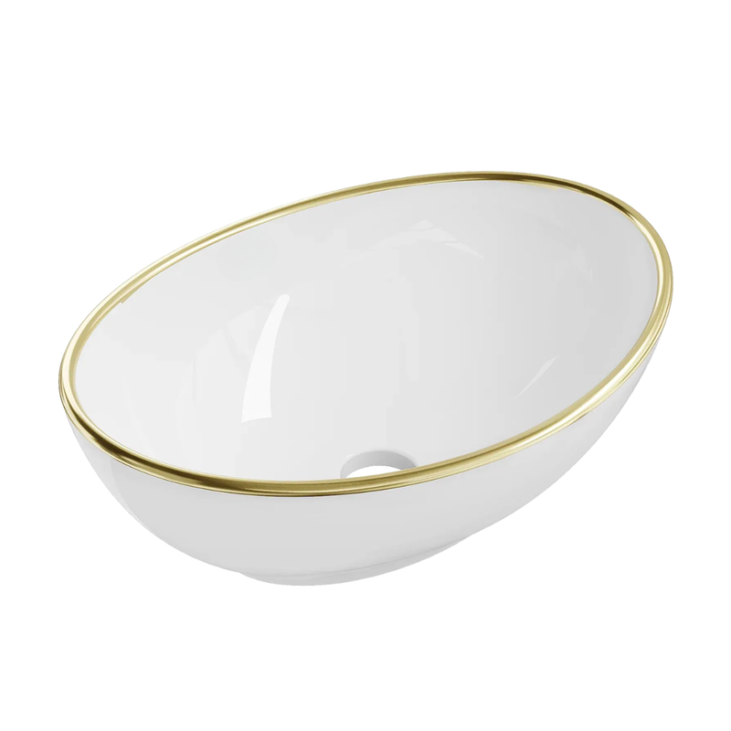 Vasque à poser arrondie VERA 40,5 x 33 cm en céramique sanitaire, disponible en blanc brillant, blanc mat ou blanc brillant avec liseré noir mat ou doré mat, sans trou de robinetterie ni trop-plein.