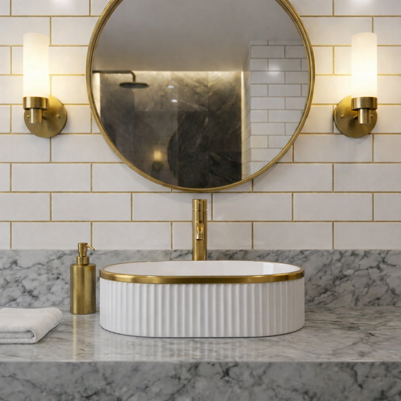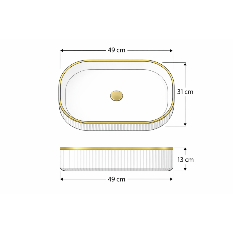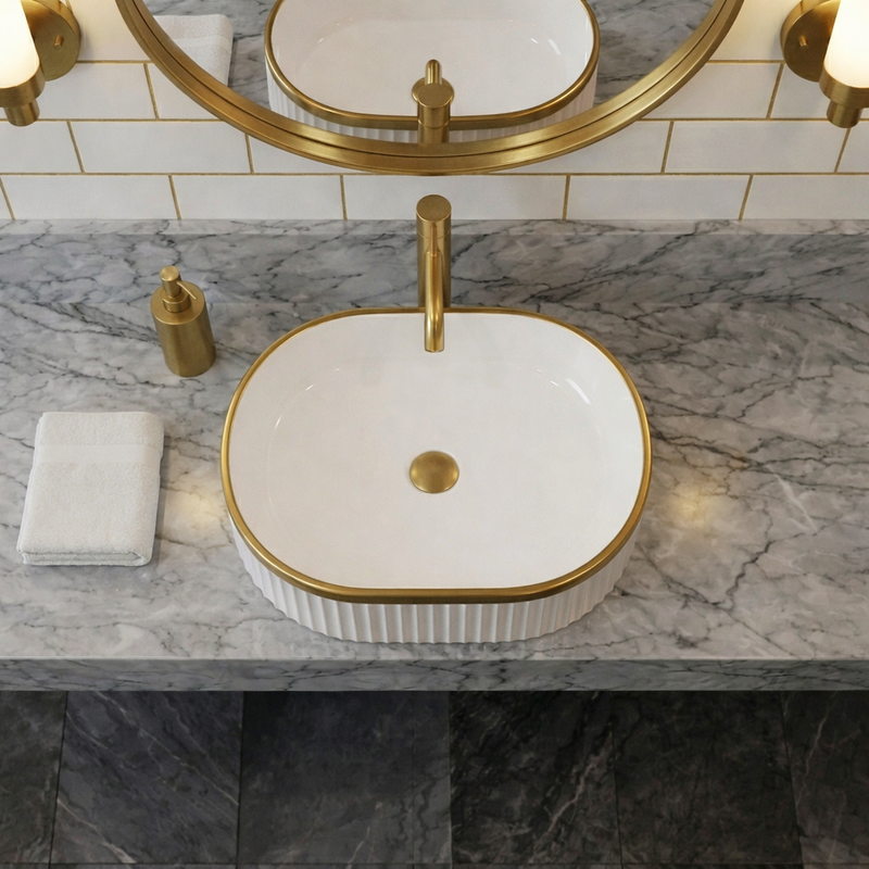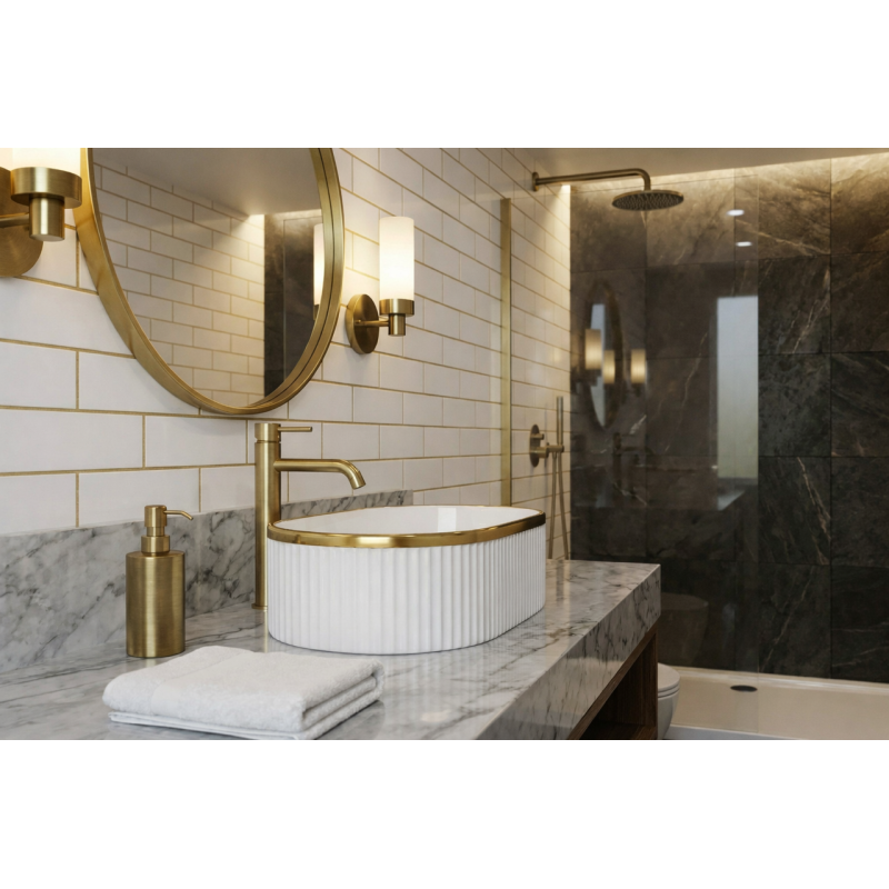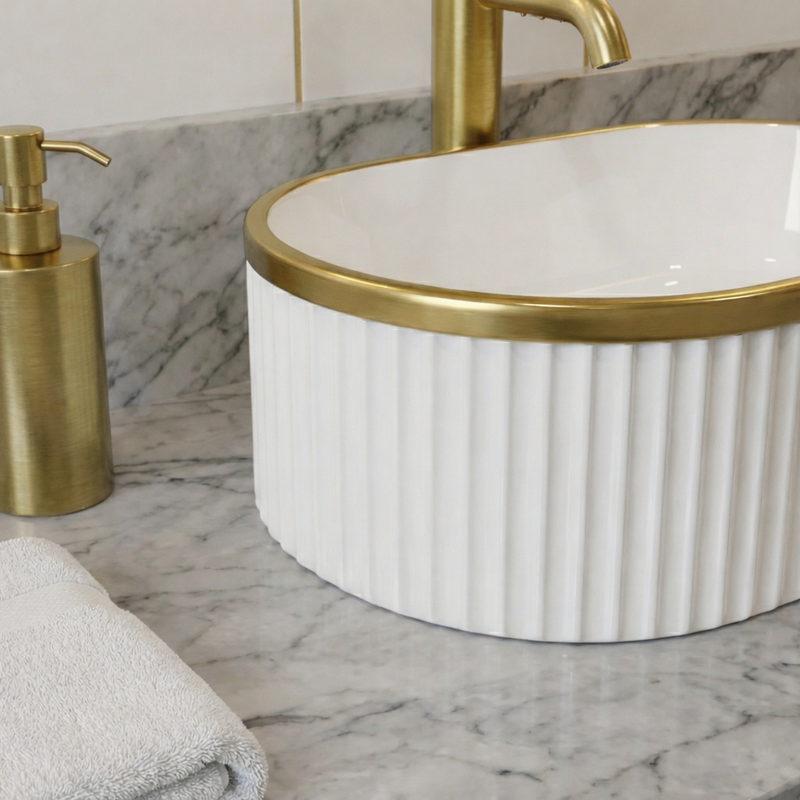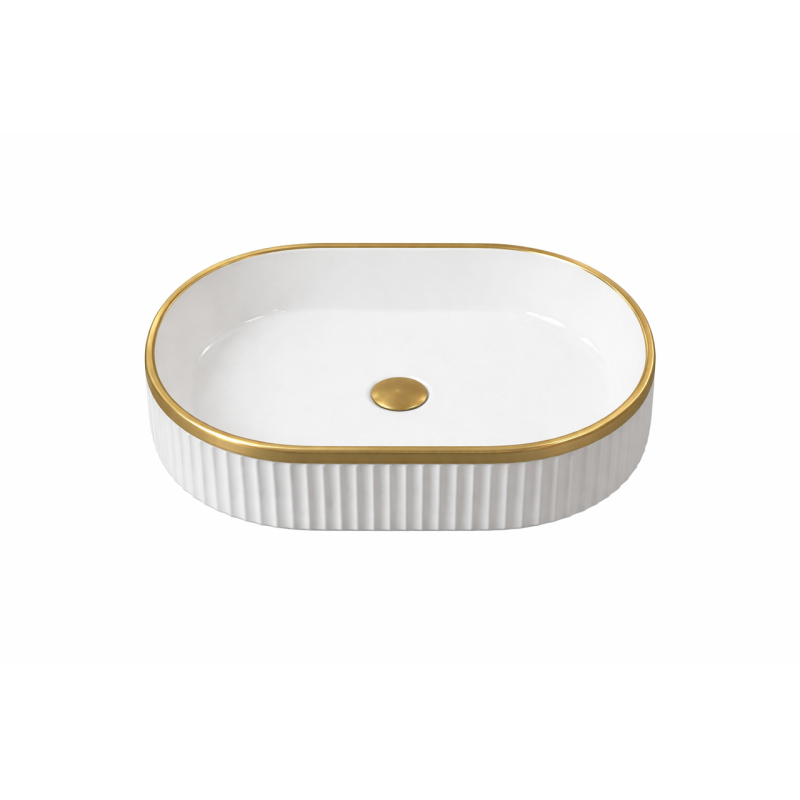 La vasque à poser ORIELA séduit par son design ovale élégant et sa finition blanc brillant soulignée par un liseré or raffiné. Cette combinaison apporte une touche lumineuse et sophistiquée à la salle de bain, tout en conservant une esthétique épurée et une présence visuelle harmonieuse.