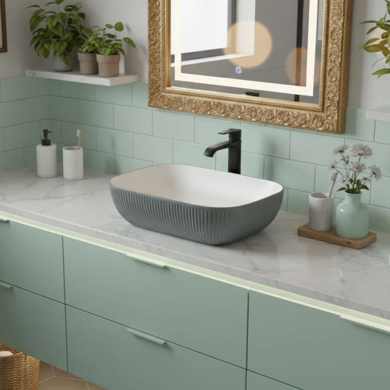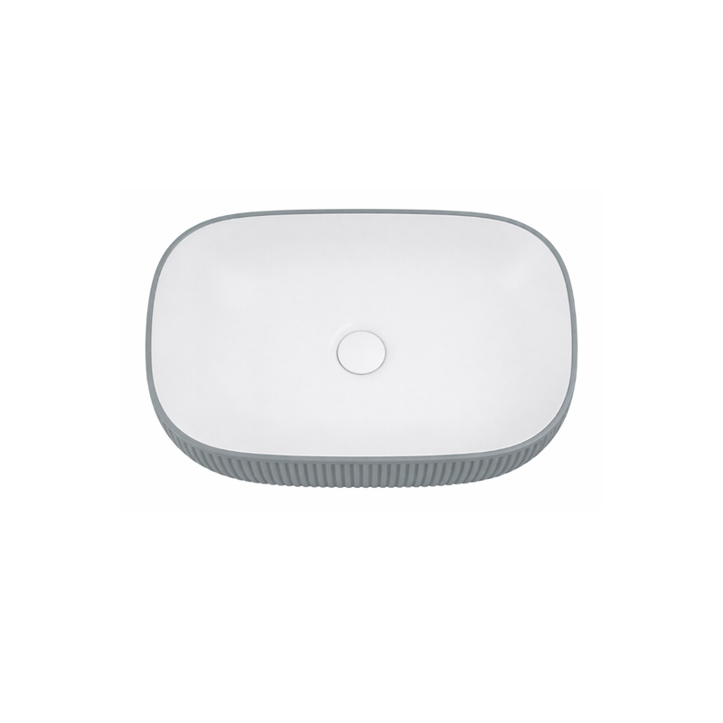 La vasque à poser SERENIA se distingue par un design rectangulaire sobre et contemporain. Son extérieur rainuré gris clair associé à un intérieur blanc mat crée un contraste doux et équilibré, idéal pour les salles de bain modernes recherchant une esthétique épurée et harmonieuse.