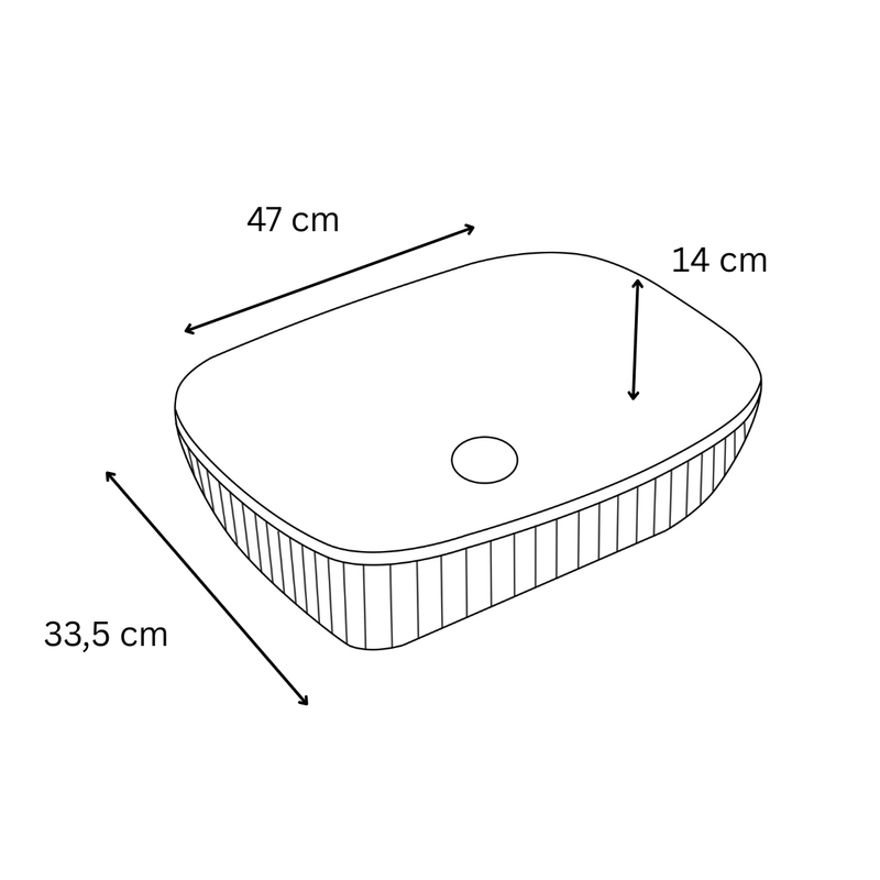 Vasque à poser rectangulaire SERENIA 47 x 33,5 cm en céramique sanitaire avec intérieur blanc mat et extérieur gris clair rainuré, sans trou de robinetterie ni trop-plein.