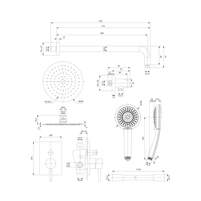 L’ensemble comprend un mitigeur encastré, une tête de douche, un bras de douche, un pommeau de douche avec flexible et un raccord mural avec support, pour une installation complète.